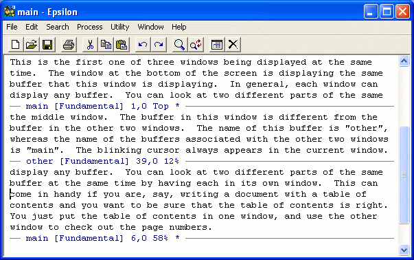 The illustration shows Epsilon with 3 windows. The top window and bottom window each show the buffer "main". Notice that although these two windows display the same buffer, they show different parts of the buffer. The mode line of the top window says 0%, but the mode line of the bottom window says 58%. The middle window displays a different buffer, named "other". If the cursor appears in the middle window and you type regular letters (the letters of your name, for example), they go into the buffer named "other" shown in that window. As you type the letters, the point (and so the cursor) stays to the right of the letters. In general, the current window refers to the window with the cursor, or the window where the "editing happens". The current buffer refers to the buffer displayed by the current window.